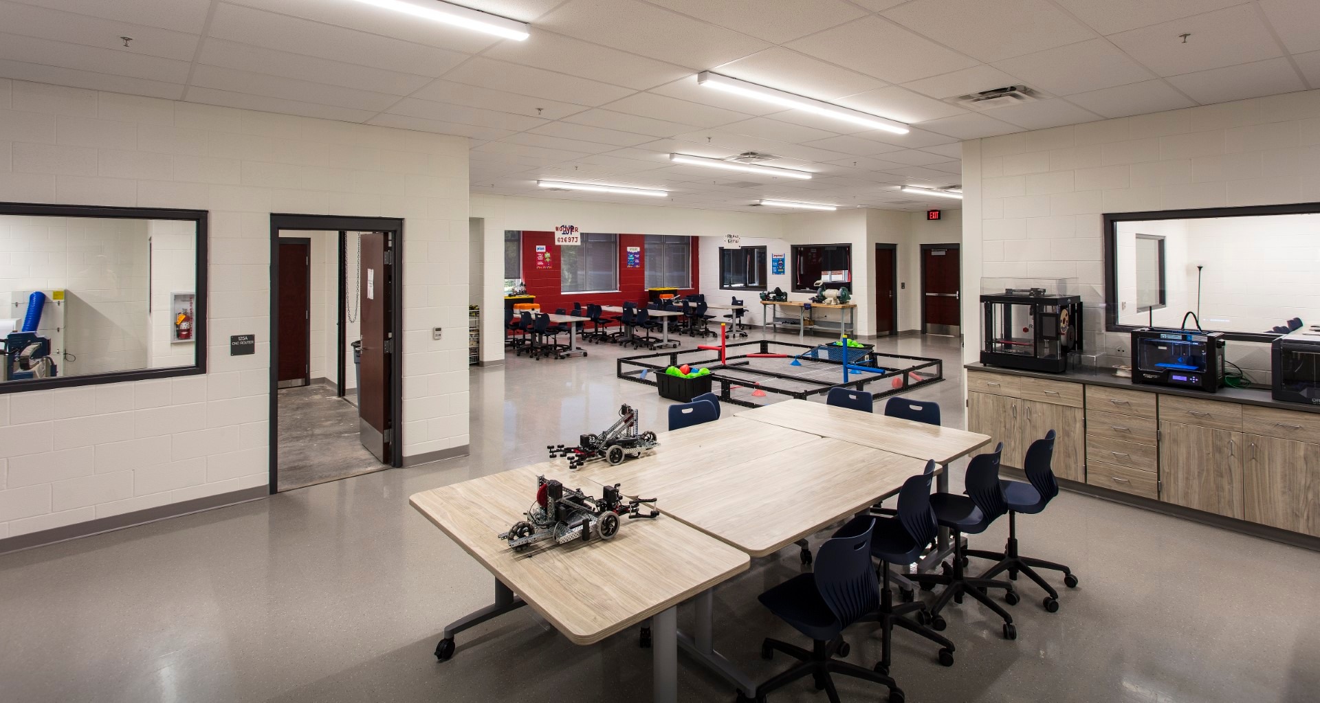 Second floor Media Center space with access to main corridor and four (4) Collaborative Hubs; One of four Collaborative Hubs for small group within the academic building; Auditorium with seating for 372; One of six science laboratories within the academic wing of the building, designed to have open floor space for experiments; 2,640 square foot Wood Shop in the Vocational Wing of the building; 2,135 square foot FAB LAB (Fabrication Laboratory) adjacent to the Wood Shop, this space has areas for 3D Printing, CNC Routing, Programming, small groups, large floor area for the competitive robot arena and more. This is a small glance at a state of the art facility