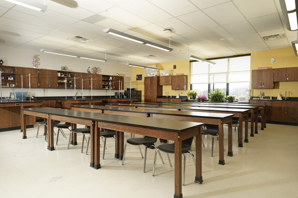 The building layout provides separate academic wings for the elementary school and middle school while sharing common areas such as the administrative offices, clinic and dining room.